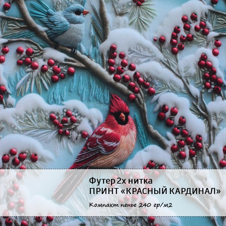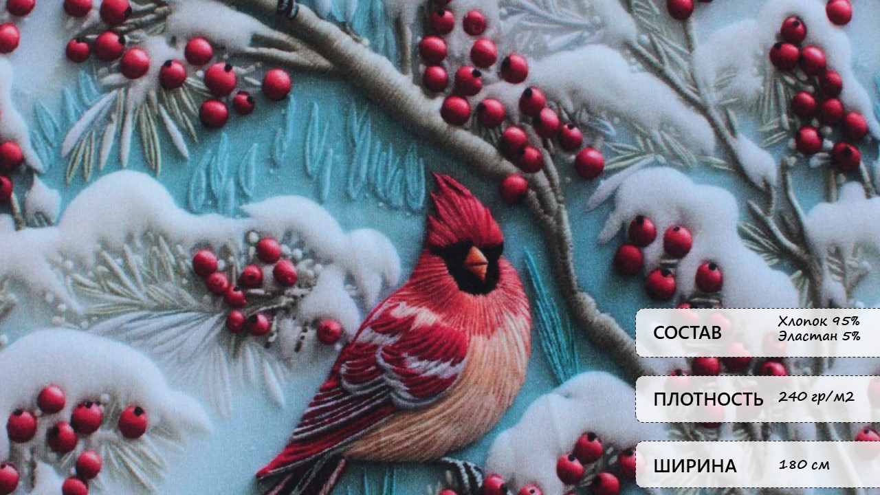 "Снегири" — это ткань, которая наполнит ваш дом теплом и зимним очарованием. Яркие снегири на фоне бело-голубой основы создают атмосферу зимней сказки, где каждый день становится немного волшебным. Мягкая петельчатая текстура и натуральный состав делают эту двухнитку идеальной для создания уютной домашней одежды, текстиля или аксессуаров. Она словно дарит тепло зимнего солнца и радость от первого снега.