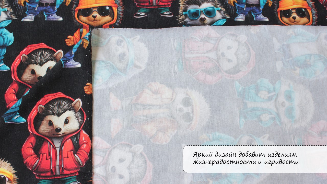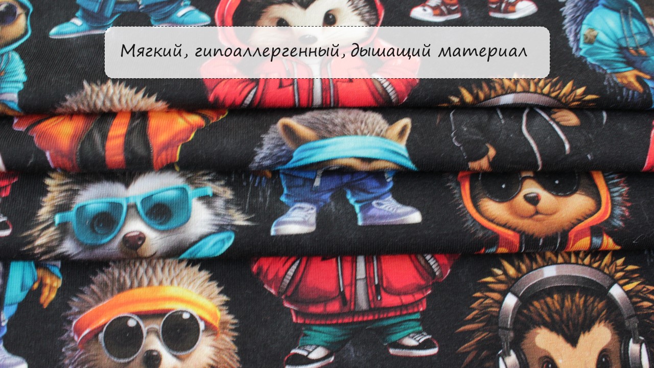 - Дизайн: Мультиколорный принт «Ежики» — забавные, милые персонажи в ярких цветах, как друзья из детских снов