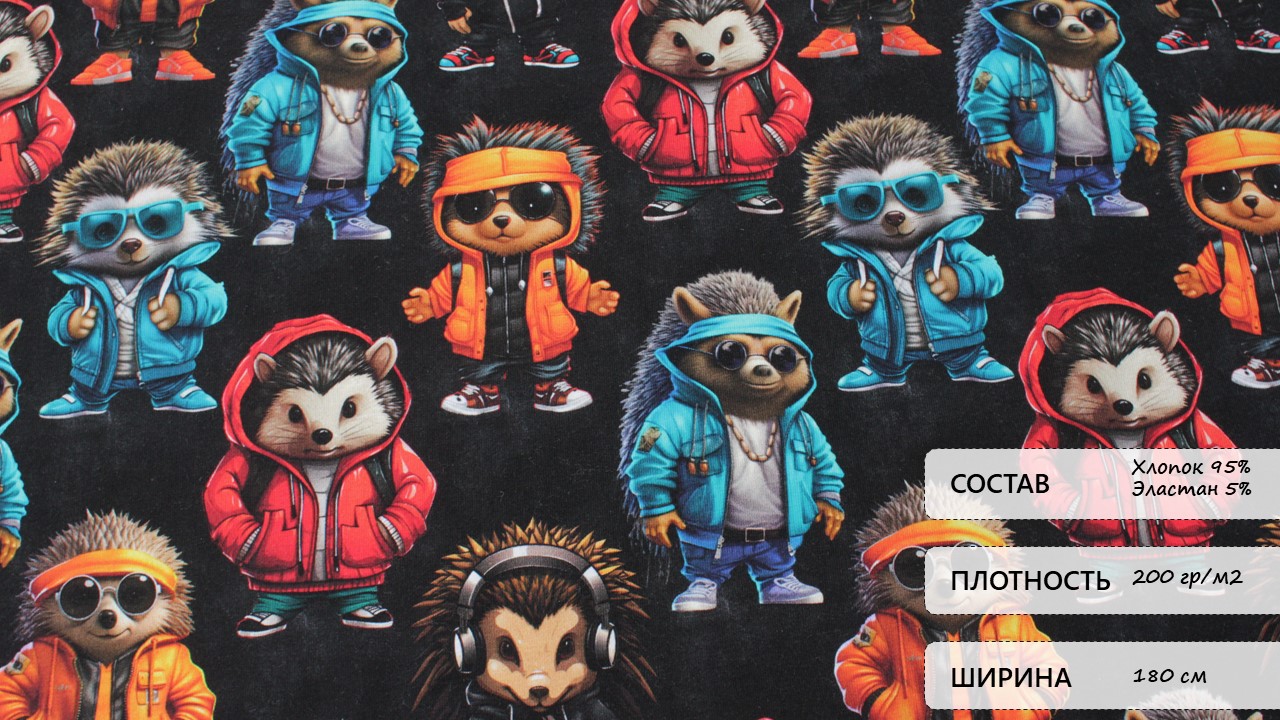 95% натурального хлопка обеспечивает исключительную воздухопроницаемость и мягкость. Эластан делает ткань гибкой и удобной, позволяя коже дышать свободно. Весёлый принт с ежиками вдохновляет. Это ткань для людей, ценящих лёгкость и свободу движения.
