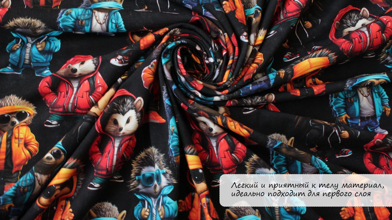 Кулирная гладь принт «Ежики» — это воплощение лёгкости и радости, где каждый ежик дарует улыбку и уют. Мультиколорный принт с забавными персонажами, высокое содержание натурального хлопка компакт-пенье и добавление эластана создают ткань, которая дышит, растягивается и возвращается в форму. Гладкая, нежная поверхность позволяет коже ощущать себя свободной и защищённой одновременно.