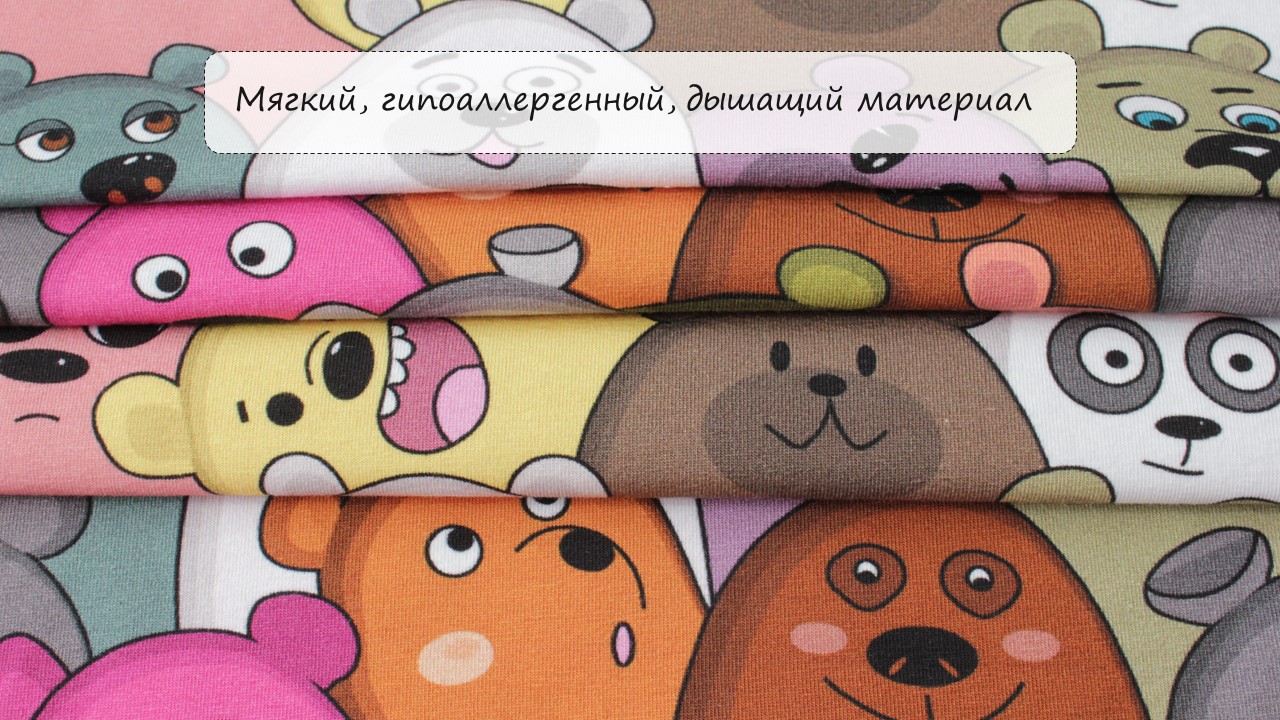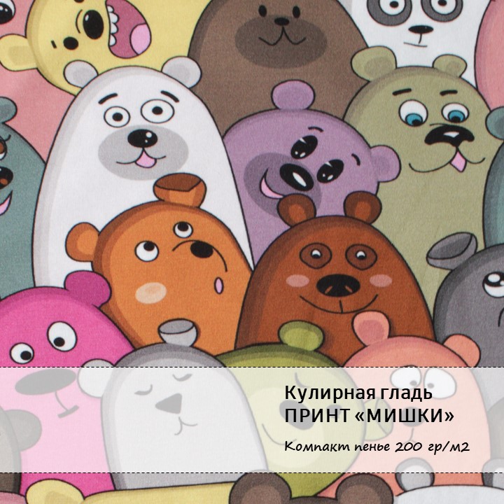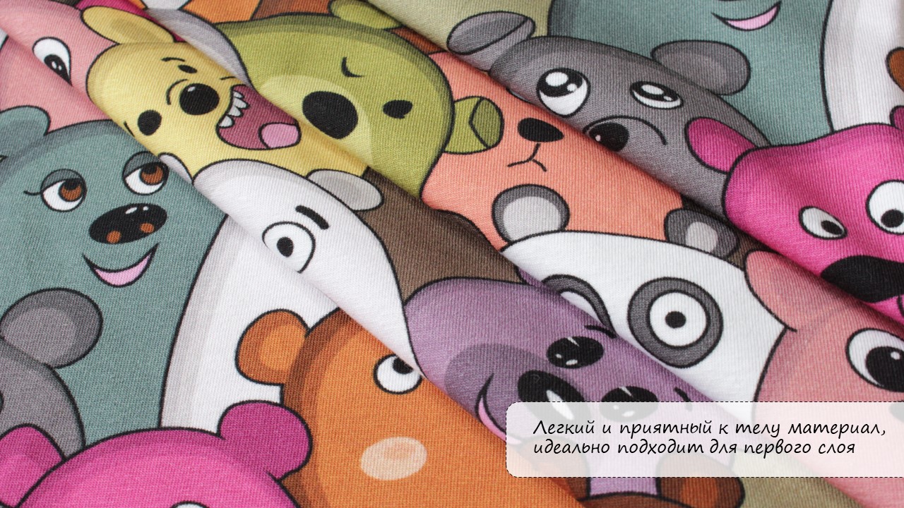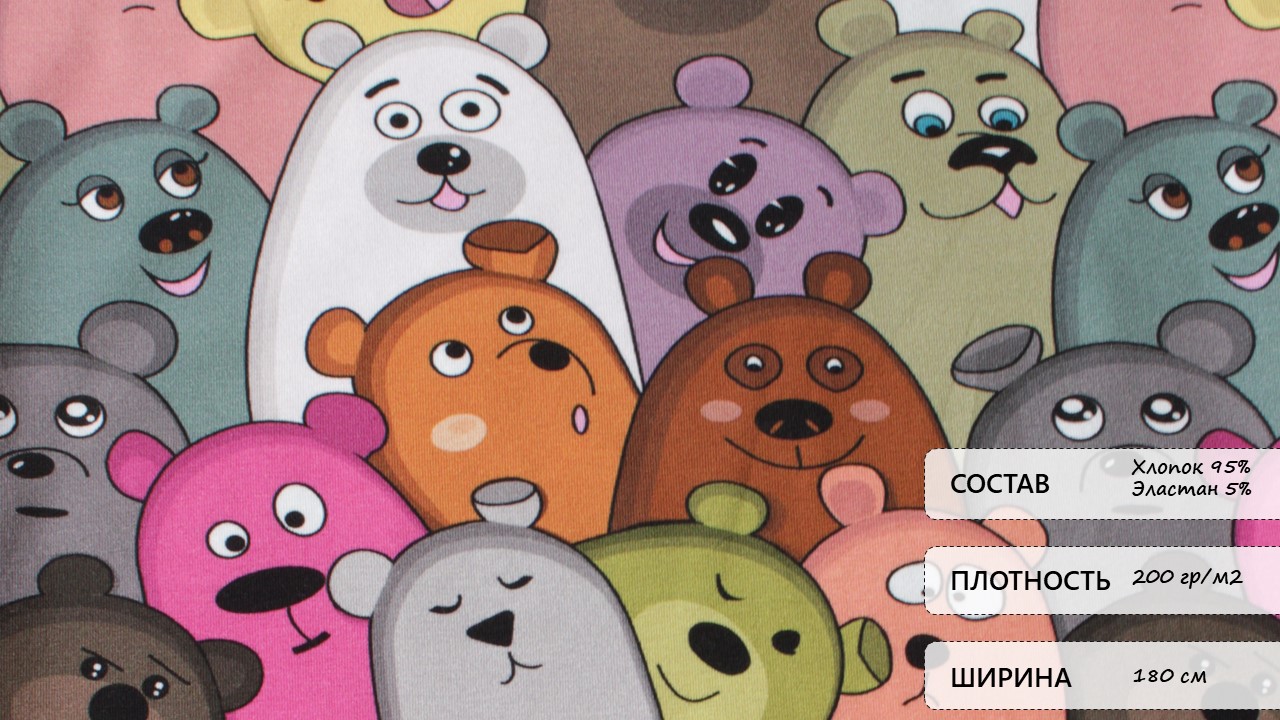 Позвольте себе окунуться в мир тепла и уюта с этой невероятно мягкой тканью "Кулирная гладь"! Её главная изюминка — очаровательный принт в виде медвежат, которые словно приглашают вас на чашечку какао в уютной обстановке. Этот материал создан для тех, кто любит комфорт, нежность и немного детской радости в повседневности.