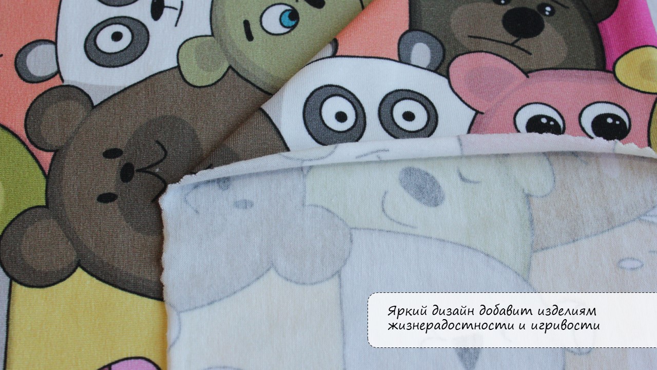 - Дизайн: Мишки на ткани выглядят так, будто они только что спустились с книжной страницы. Яркие, игривые и немного наивные, они добавляют изделиям особого очарования.