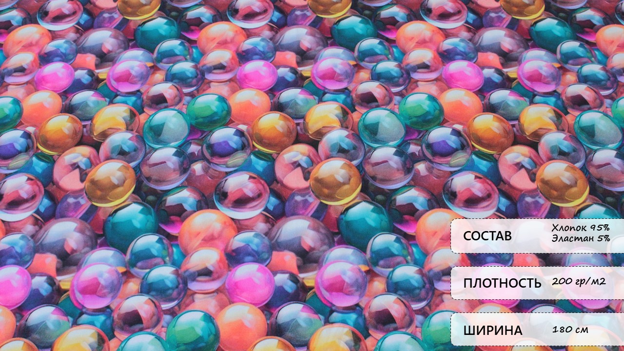 Позвольте себе окунуться в мир легкости и воздушности с этой удивительной тканью "Кулирная гладь"! Её главная особенность — захватывающий принт в виде мыльных пузырей, которые словно парят на поверхности материала, создавая ощущение беззаботности и свободы. Этот материал создан для тех, кто ценит комфорт, свежесть и немного волшебства в повседневной жизни.