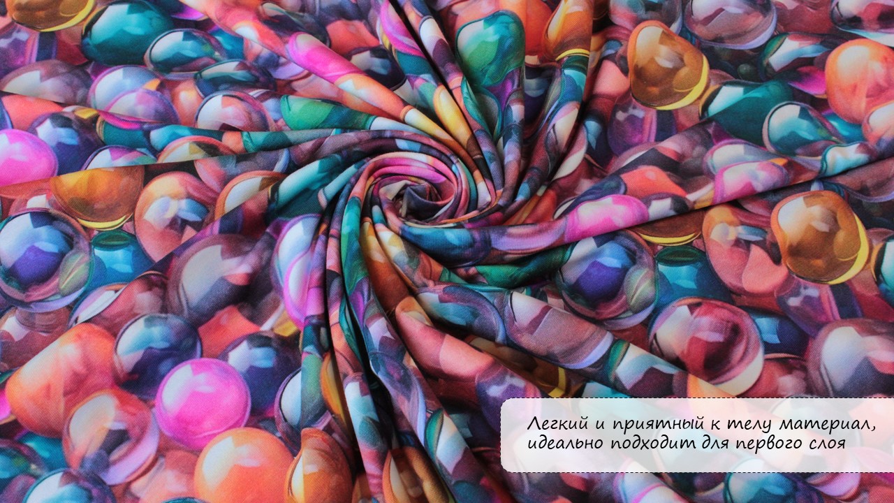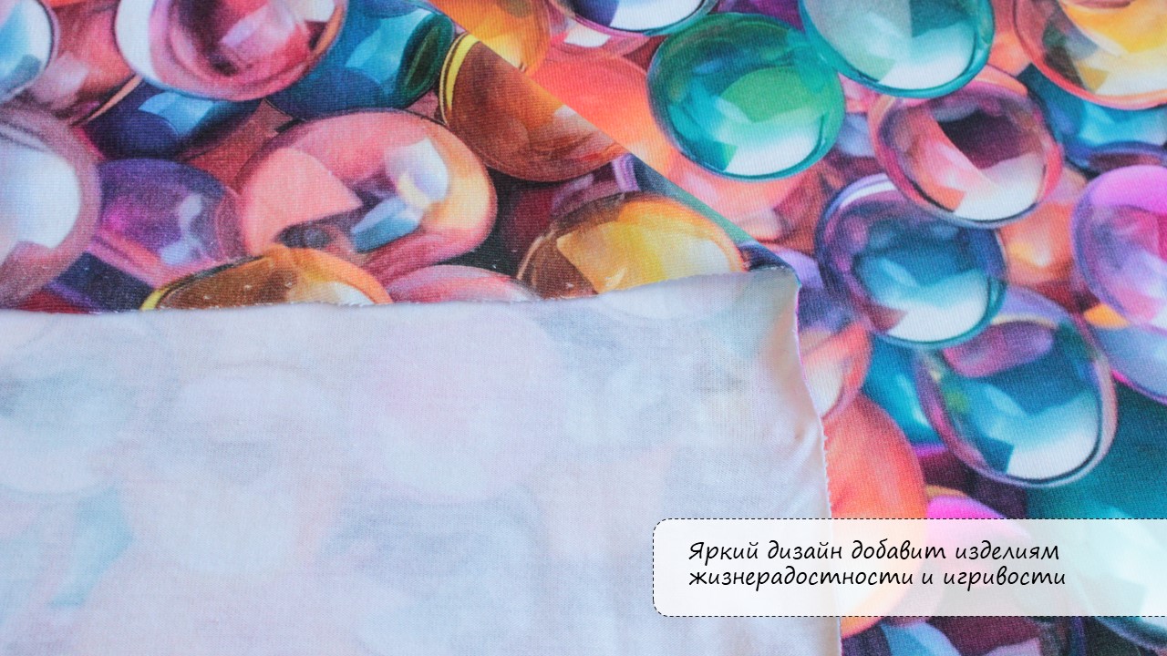 - Дизайн: Мыльные пузыри на ткани выглядят так, будто только что вылетели из детской игрушки. Их яркие, переливающиеся оттенки добавляют изделиям игривости и динамики.